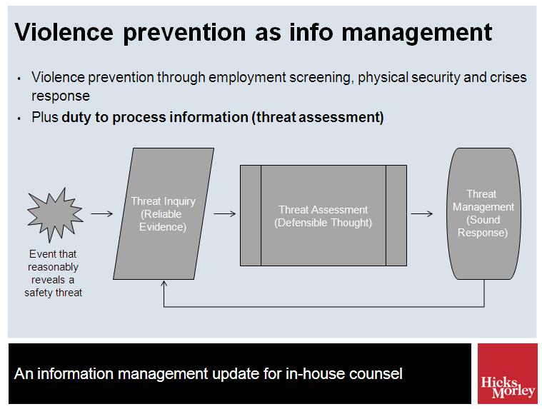 This widely-accepted view is why violence prevention rests so heavily on processing information or, more specifically, on “threat assessment.” Whether a duty to prevent violence is based on workplace health and safety legislation, occupiers liability legislation or common law duties, implementing reasonable employment screening, reasonable physical security controls and a reasonable emergency response plan is not enough. Implementing a reasonable threat assessment system is an important part of violence prevention, and is necessary to manage the risk of violence that is perpetrated by individuals who are “knowable” to an organization (e.g., customers, patients, students, current and former employees and domestic partners of current employees).